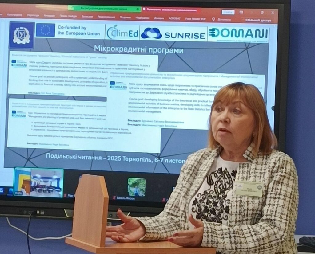 On November 6, 2025, at the Plenary session of the XI International Scientific and Practical Conference PODILSKY READINGS – 2025 “Scientific Space: Interdisciplinary Directions and Strategies for the Development of Territorial Communities,” held in Ternopil National Pedagogical University (Ukraine), Prof. Nadiya Maksymenko (V.N. Karazin Kharkiv National University) spoke about the features of the DOMANI project. A short article by Maksymenko Nadiya and Cherkashyna Nadiia, “The role of international grant projects in shaping contemporary trends in geoecological education and awareness,” was published in the conference proceedings.